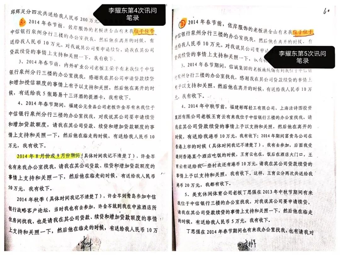 2018年1月19日,南安市人民法院对原中信银行泉州分行行长李耀东涉嫌受贿罪一案作出一审判决认定李耀东犯受贿罪,判处有期徒刑10年,并处罚金100万。李耀东不服提出上诉。2018年11月29日,泉州市中级人民法院裁定撤销一审判决,发回重审。2019年10月8日,南安市人民法院再次公开开庭审理本案。